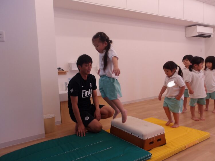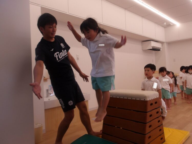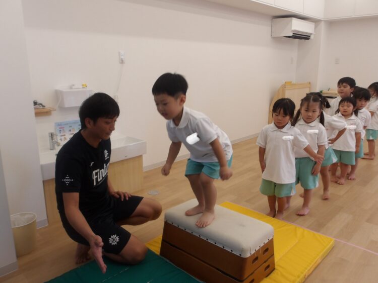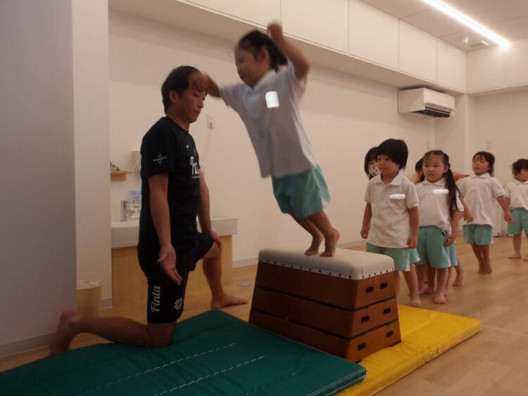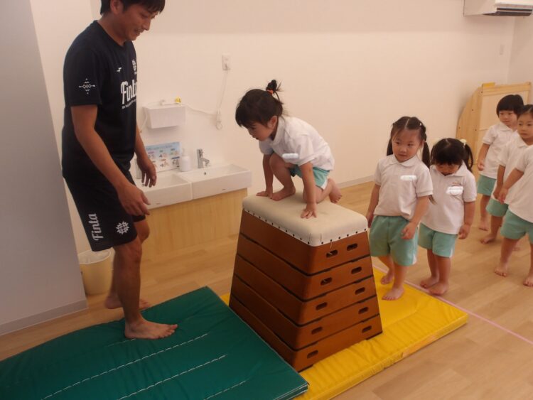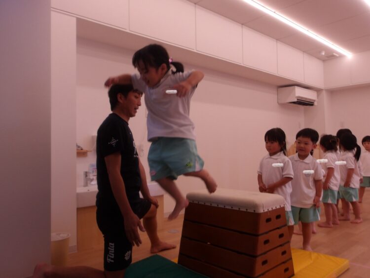 上に乗ってマットの上へジャ〜ンプ!みんなあっという間ににクリアです。そして2段、3段・・・どんどん飛び箱は高くなり、増えていく度に「キャーーー!」と声をあげつつも挑戦意欲を掻き立てられワクワクしながら挑戦していた子どもたちです