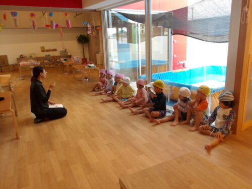 楽しい水遊びの前にプールでのお約束をみんなで確認しました😃