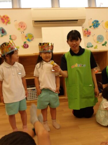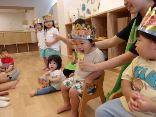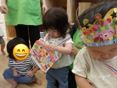 最年少のお友達も王冠やお誕生日カードに興味津々でみんなの前に出てニコニコで顔を見せてくれました😄