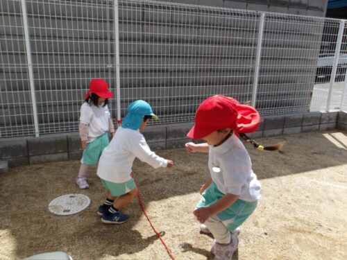 今日は大縄を持って行って保育者が蛇に見立てて揺らしたりするところを子供達は踏まないようにとジャンプして飛び越えて楽しく遊べました☺️