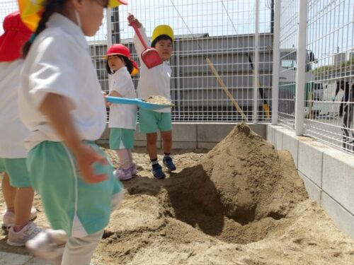 保育者が砂場の段差から落ちないように歩くのを見て子供たちも一緒にやりだし砂場を海に見立て落ちたらサメに食べられる遊びが始まり楽しく遊べました![]()