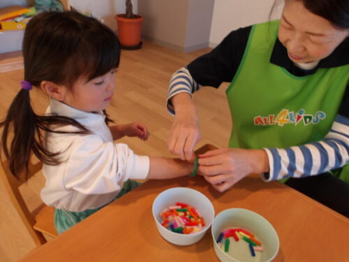 お部屋では昨日の続きの紐通しでのネックレス&ブレスレット作りが始まりました。今日はストローの他にもハートや星、お花の形の飾りも加わり、夢中になって取り組んでいました![]()