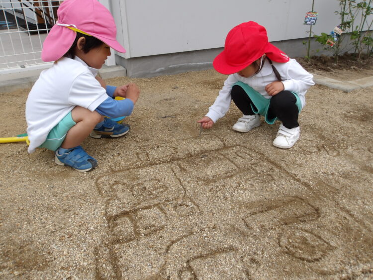 雨上がりの地面はお絵描きに絶好のキャンバス!!お家や動物園、水族館の絵を描いては「みてみてー!」と披露してくれました。