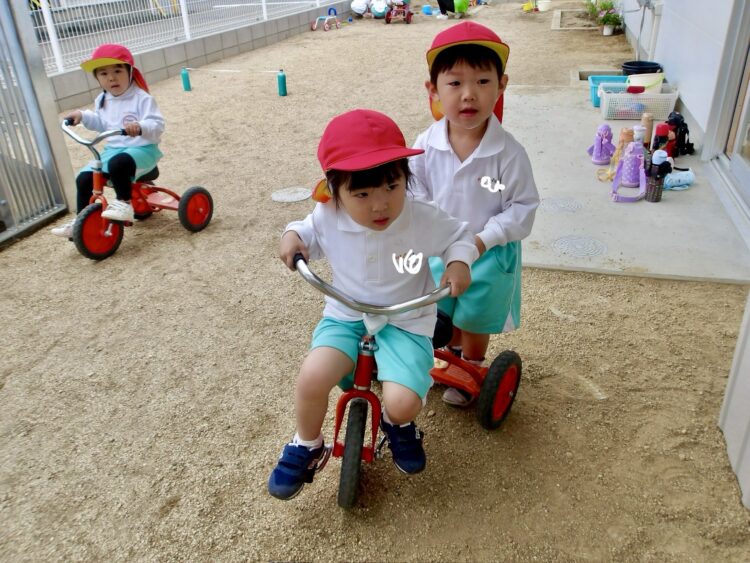 三輪車では「うしろからおして〜」「いいよー!」と仲良く助け合って遊ぶ姿が微笑しかったです![]()