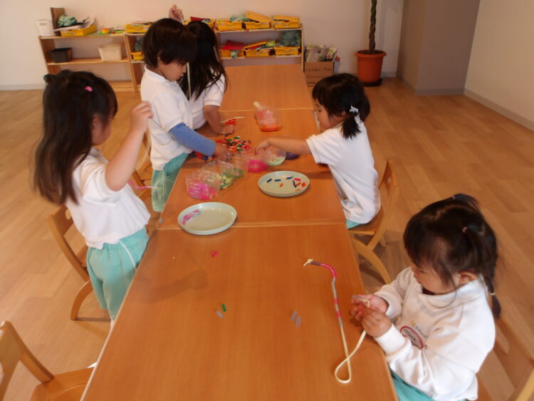 皆んな上手に自分で黙々とヒモにストローを通して作っていましたよ☺️