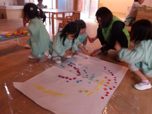 夕方にハサミで切った紙を大きな虹か描かれた画用紙に貼りました😊
