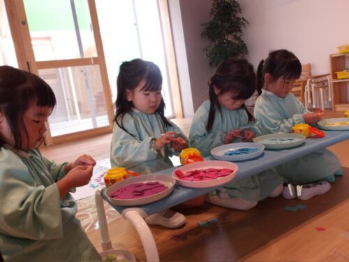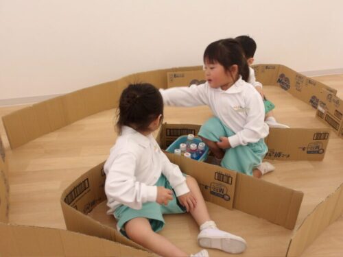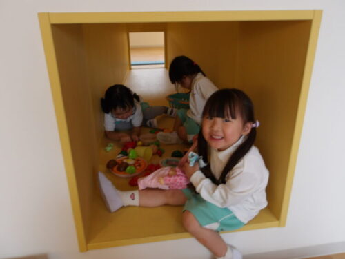 おままごとコーナーでは、自分たちでお家を作りここはお風呂でここが寝るところね!と友達に説明しながら仲良く遊んでいましたよ😁