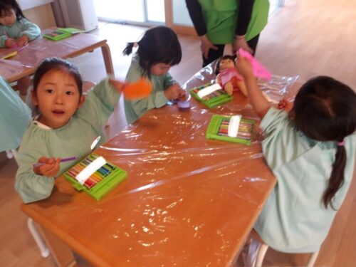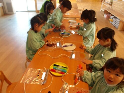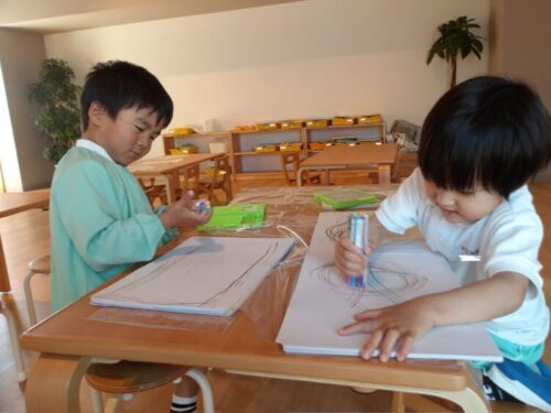 絵本のもったいないばあさんに出てくる虹色鉛筆を思い出し、年長さんは実際にやって虹を描いていましたよ♪