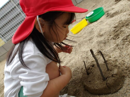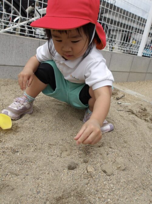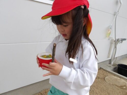 昨日公園で拾った木の枝やたんぽぽを砂場で使ってケーキやジュース作りが始まりました😃