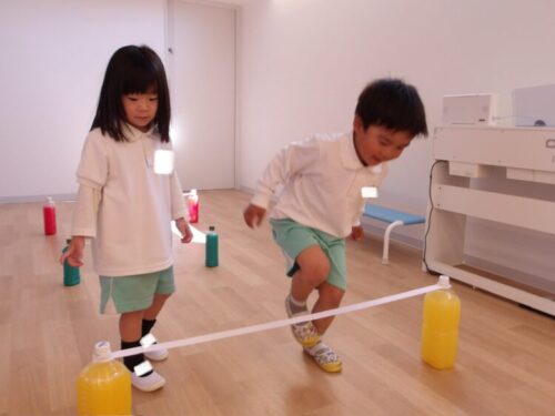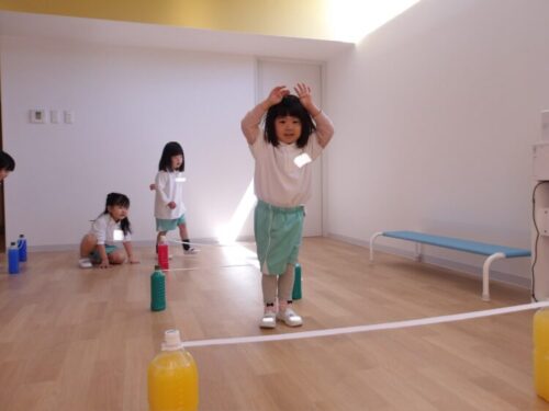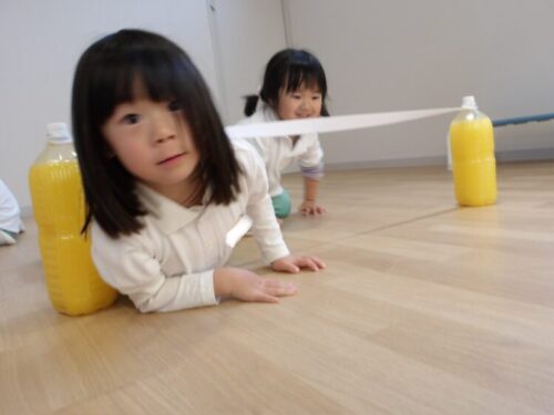 昨日出して遊んだジャンプ遊具をやりたいと今日も出して遊んでいると今日は新しい遊び方の発見‼️1人の子が身体が当たらないように潜り抜けて遊びだすと他のお友達も真似して遊ぶ姿がありましたよ😄