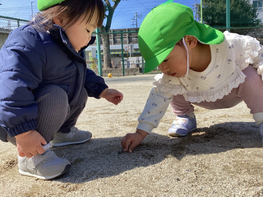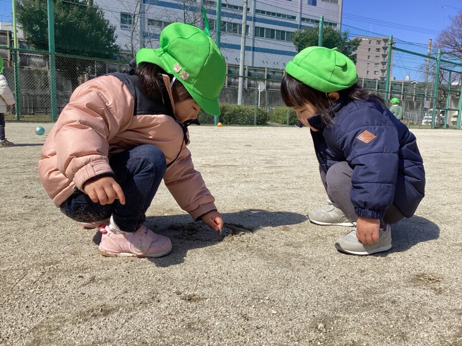 グラウンドの別の場所では石や枝を見つけて砂にお絵描きTime🎵
