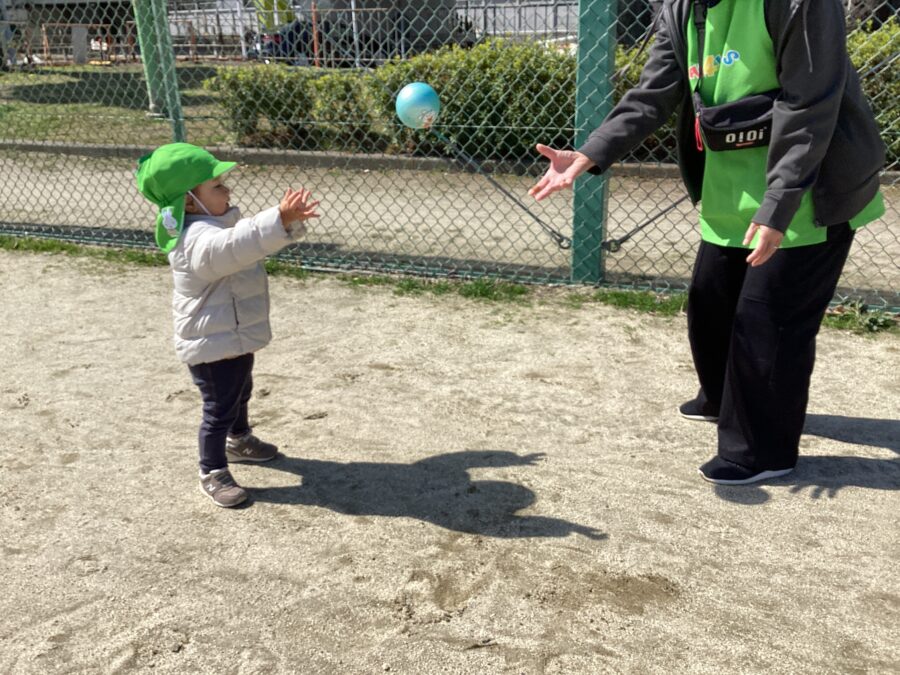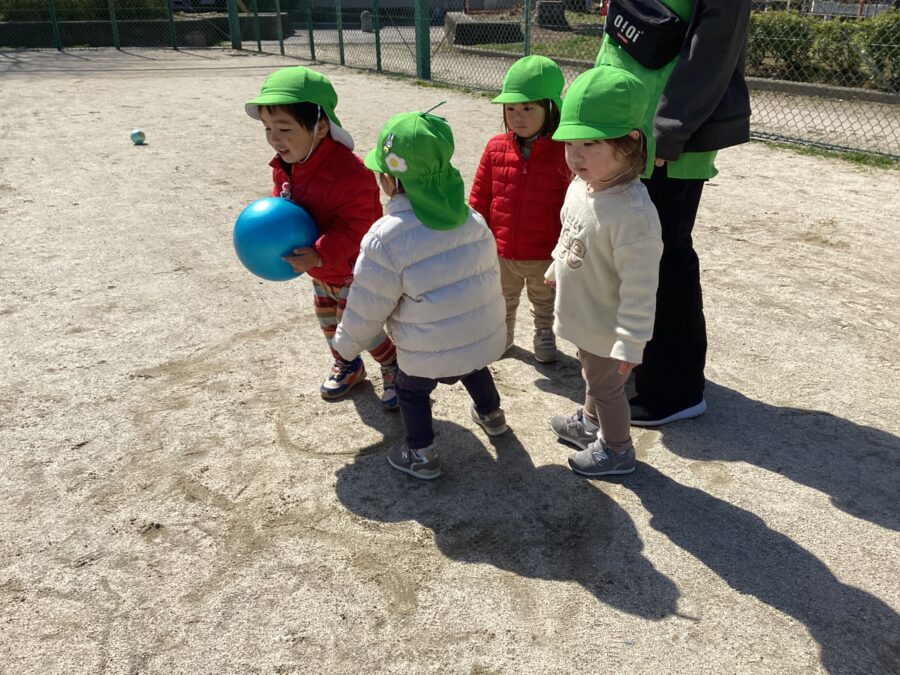 保育者が投げるボールをキャッチしようと、うんと手を伸ばしたり集めたボールを体の周りに置いたりして、みんなご機嫌な表情を見せてくれました💕