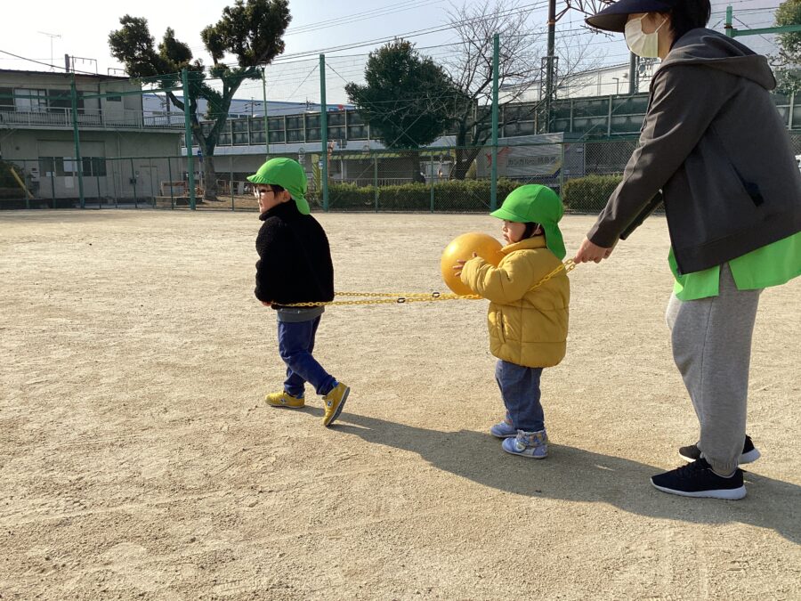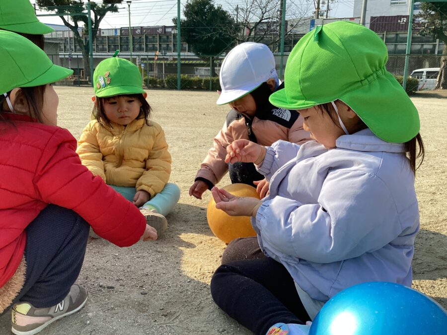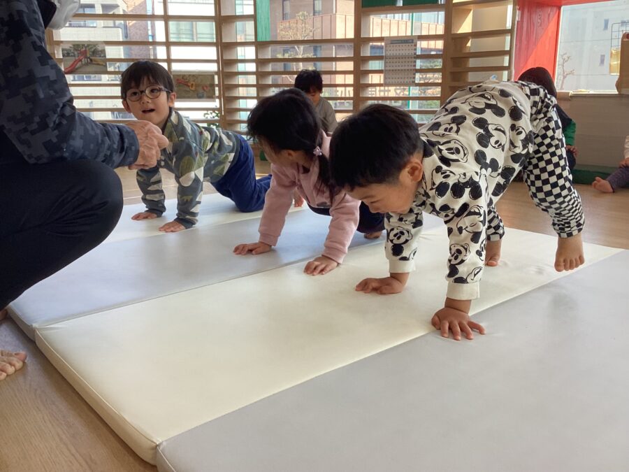 カエルジャンプでは両足をたかーく上げようと張り切り、バランスを上手にとっていてひまわり組さんたちはさすがでした![]()