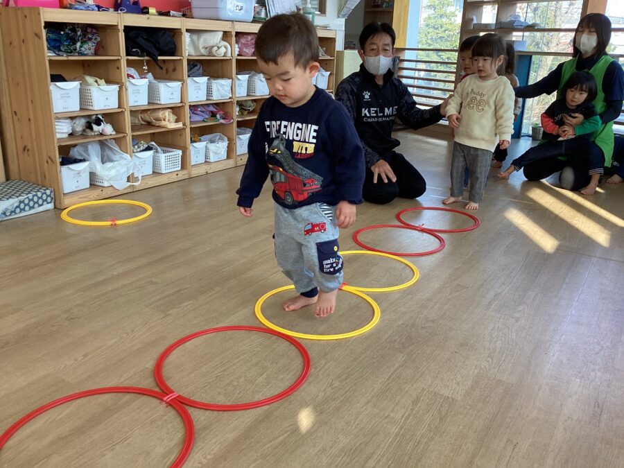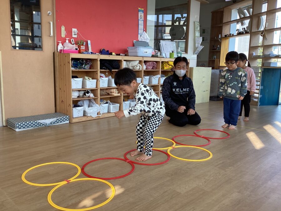 フープの中にジャンプするアクティビティも〇の中から体が出ないように上手にジャンプしていました👏