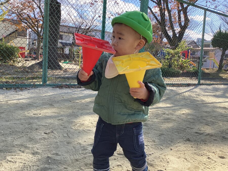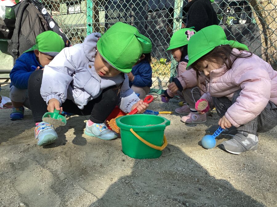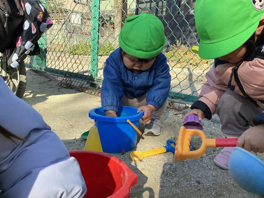 お部屋でまったりままごとを楽しむお友だちが今日は多かったからか、グラウンドでも砂遊びの玩具で色々なご飯やスイーツを作りが大人気でした✨
