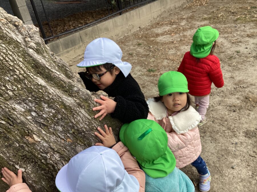 大きな木の幹や切り株に登ってみようとしたりして、自然との触れ合いタイムもありました![]()