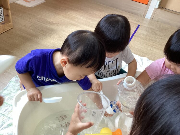 ペットボトルやレンゲ、カップを使ってたくさんの水をすくい、保育者や友達とかけ合っていました💧