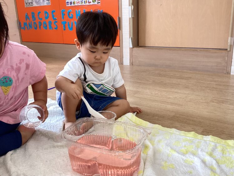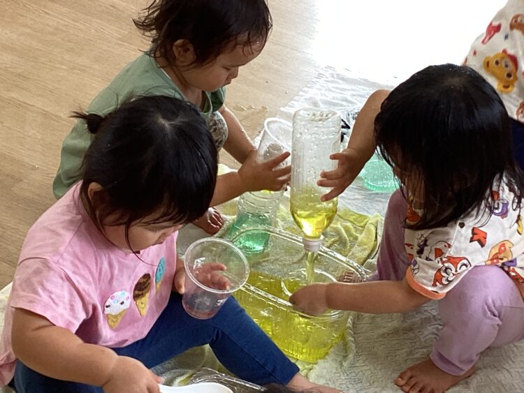 色水をジュースに見立てて「きいろはバナナジュースで〜」「いらっしゃいませ〜!」と、ジュース屋さんになりきり、ジュース作りを楽しんでいました🍹