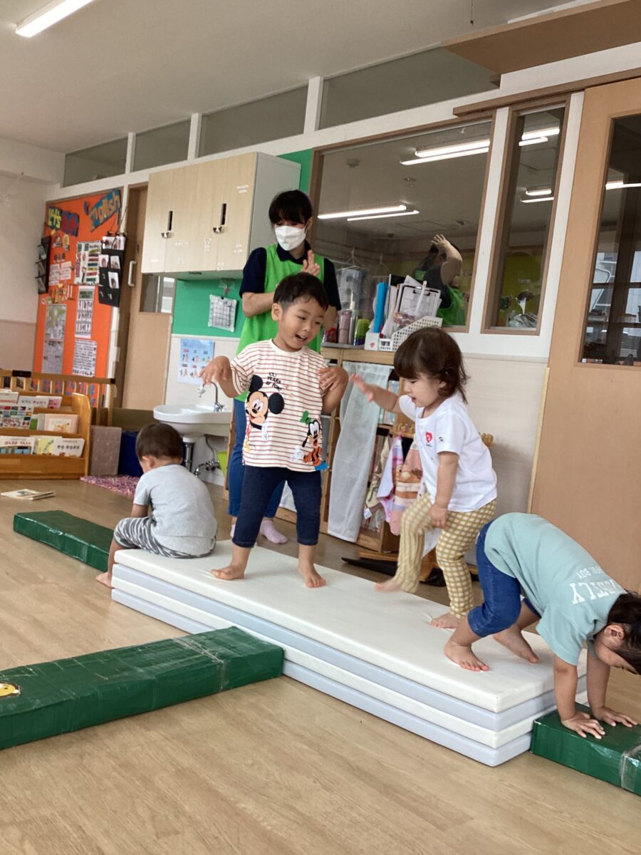 マットや台、ゴムがある中でおいかけっこをすると大喜び😆