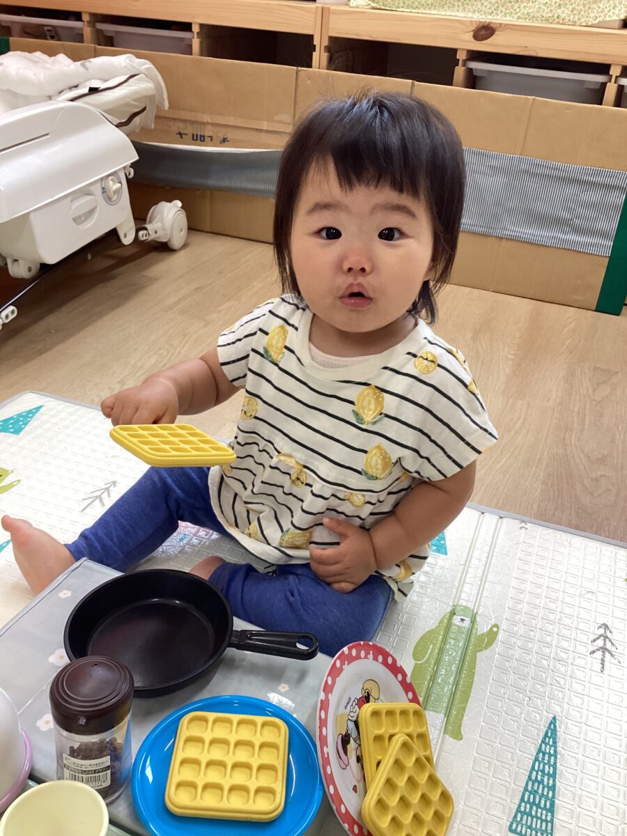 おままごとのお玉やフライ返しをもってお料理👩🍳