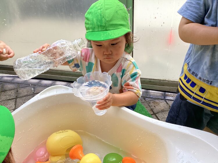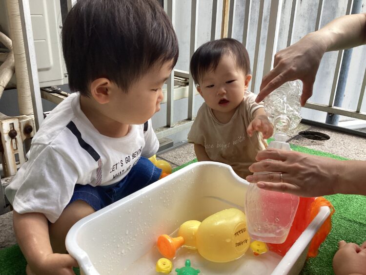 水の冷たさが気持ちよくて、「もっとあそびた〜い!」と、水あそびを楽しんでいました🙌