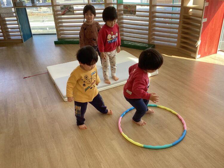 お部屋あそびを選んだお友だちはフープやマットを使って運動遊び🎵