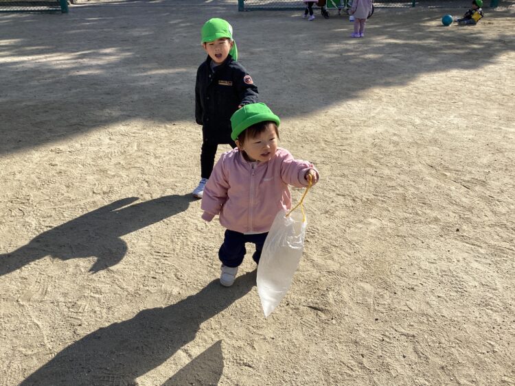 ビニール袋の凧をもって探索あそびを楽しんだり・・・![]()