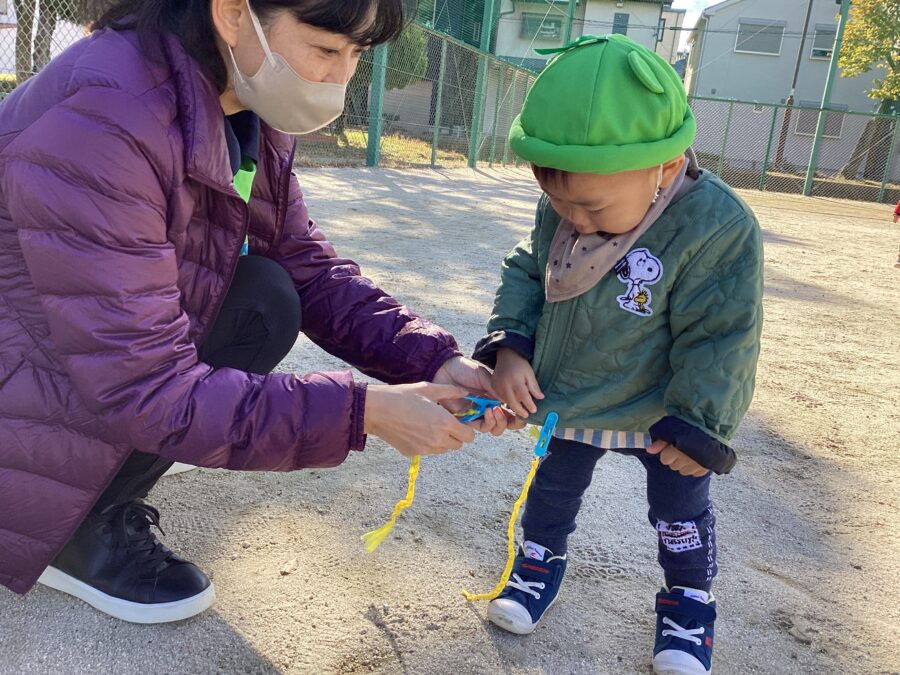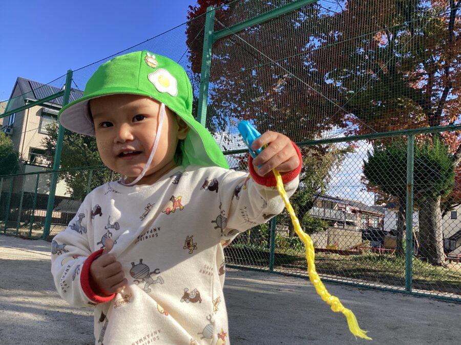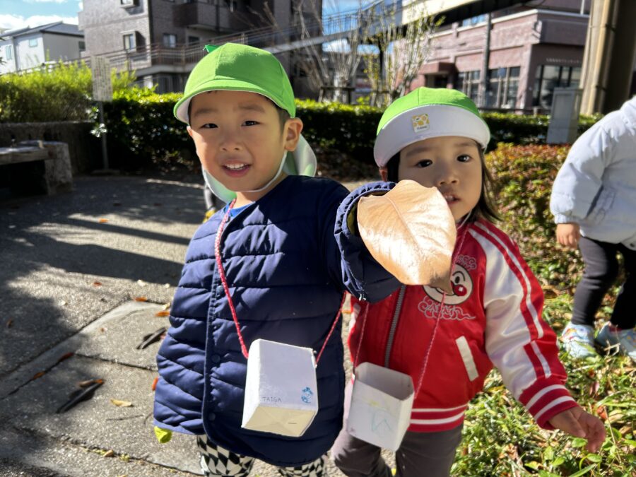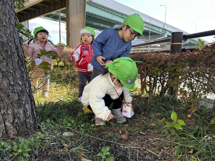 まつぼっくりや木の実を見つけると「どこ?」とみんなで探し始め、拾った実をお友だちに分けてあげる姿も見られました🩷