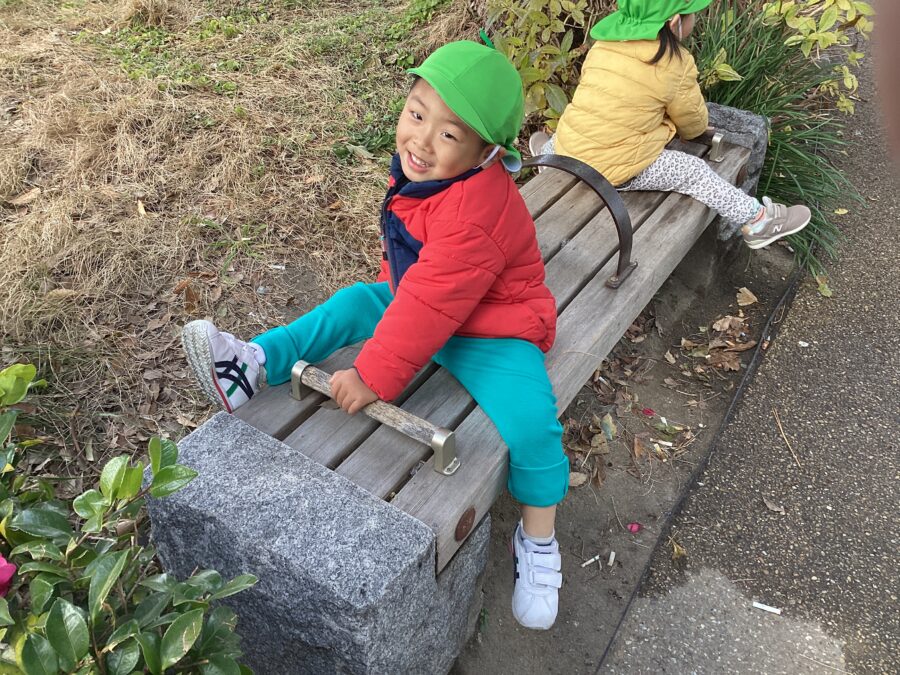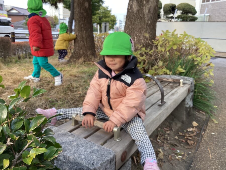 ベンチを乗り物にして「しゅっぱつ、しんこ~う✊」