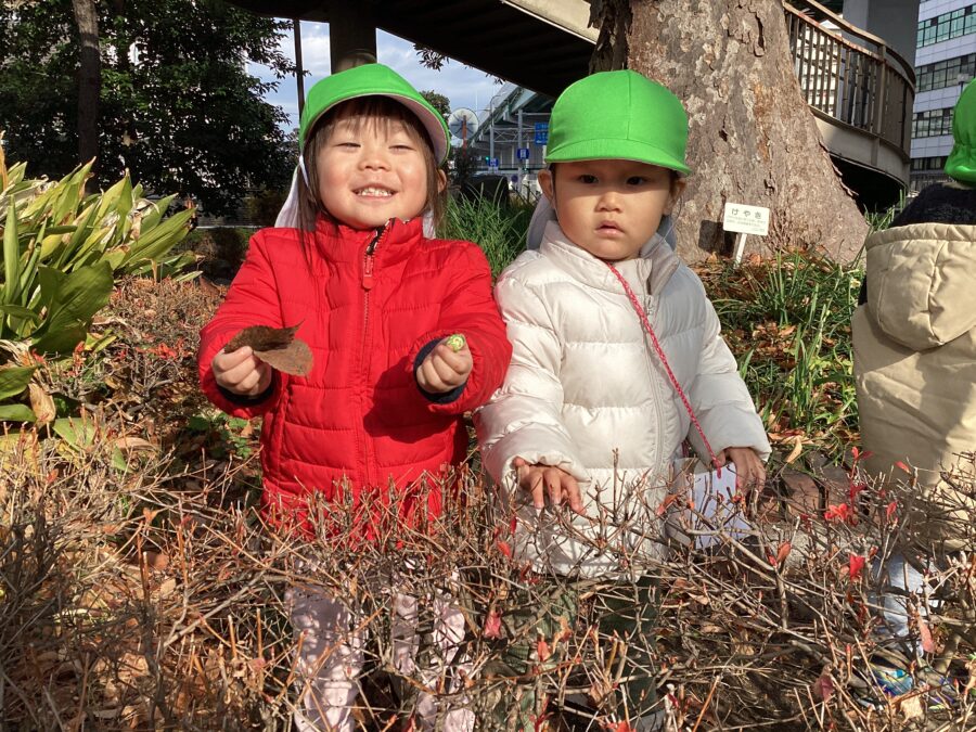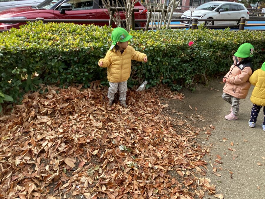落ち葉のお山に登って降りてを繰り返してみたり、と体を動かす遊びも大盛り上がりでした!