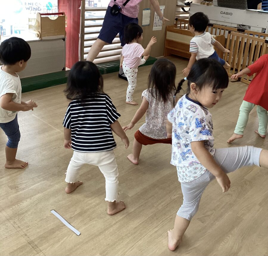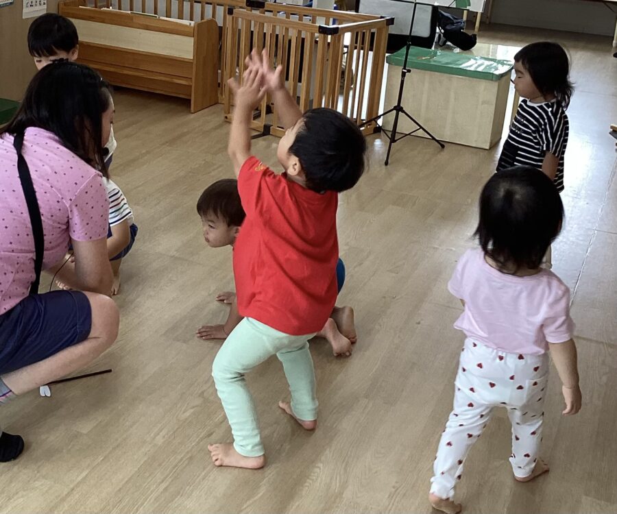 上や下、いろいろなところに飛ぶバッタをパチンパチン👏と両手で捕まえたり、片足立ちをしてトンボに変身して遊びました☺️