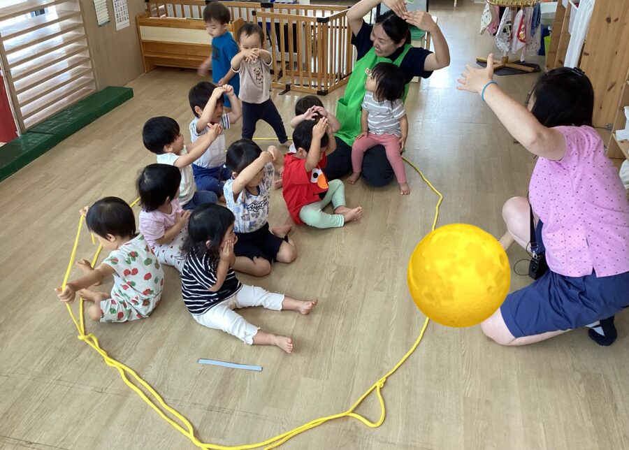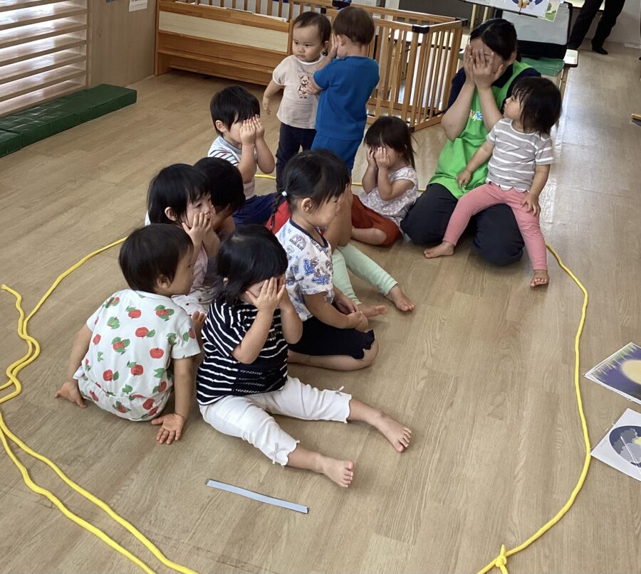 ピアノのアレンジに合わせて満月を作ったり、顔を両手で隠して、月が雲で隠れる様子を表現して遊びました☺️