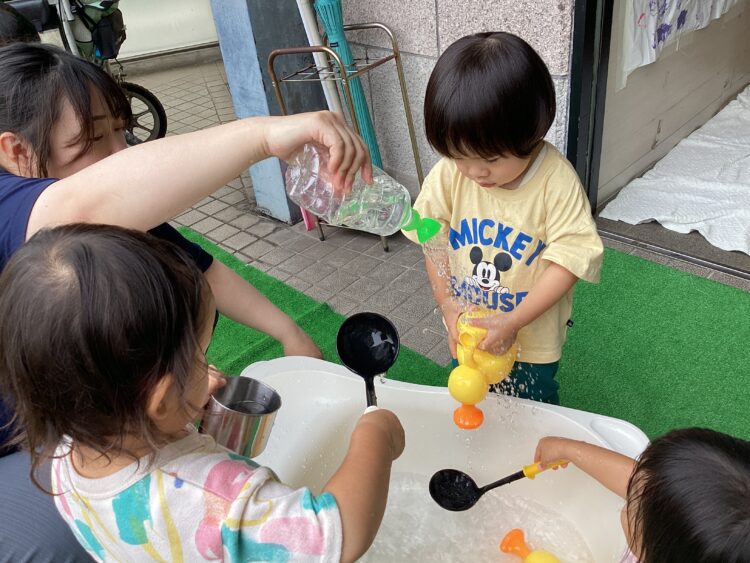 勢いよく水が流れることが楽しくて、何度も水を入れて流すことを楽しむお友だちもいましたよ😄