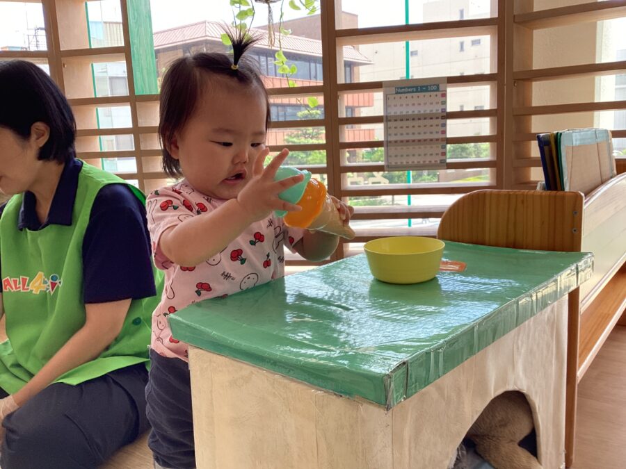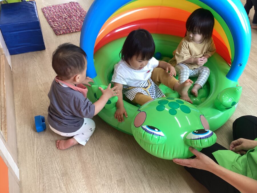 カラーボールをシャワーにして「つめたいね~」「もっとかけて!!」など楽しいお話しも聞こえていました![]()