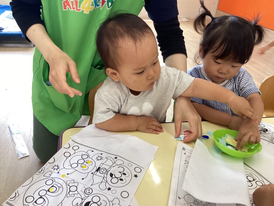 「とれないよ~」と保育者と一緒に指をひっかけてシールを剥がしてみたり、