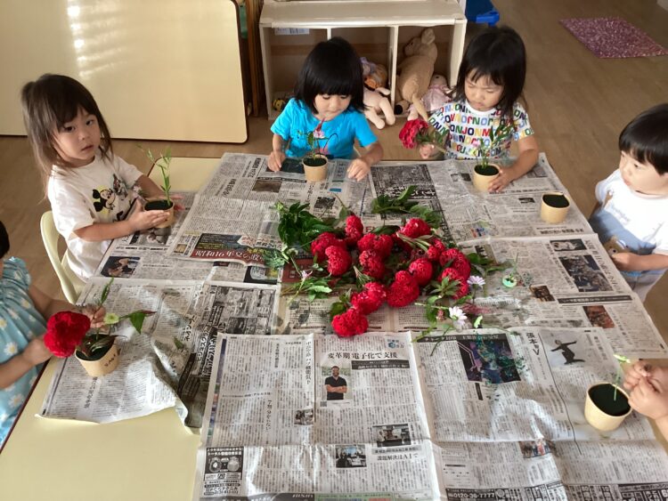 「これなぁに?」と質問したり、保育者が話すことを真似して「ケイトウ」と繰り返したりしてみんな8月の花に興味津々な様子でした👀