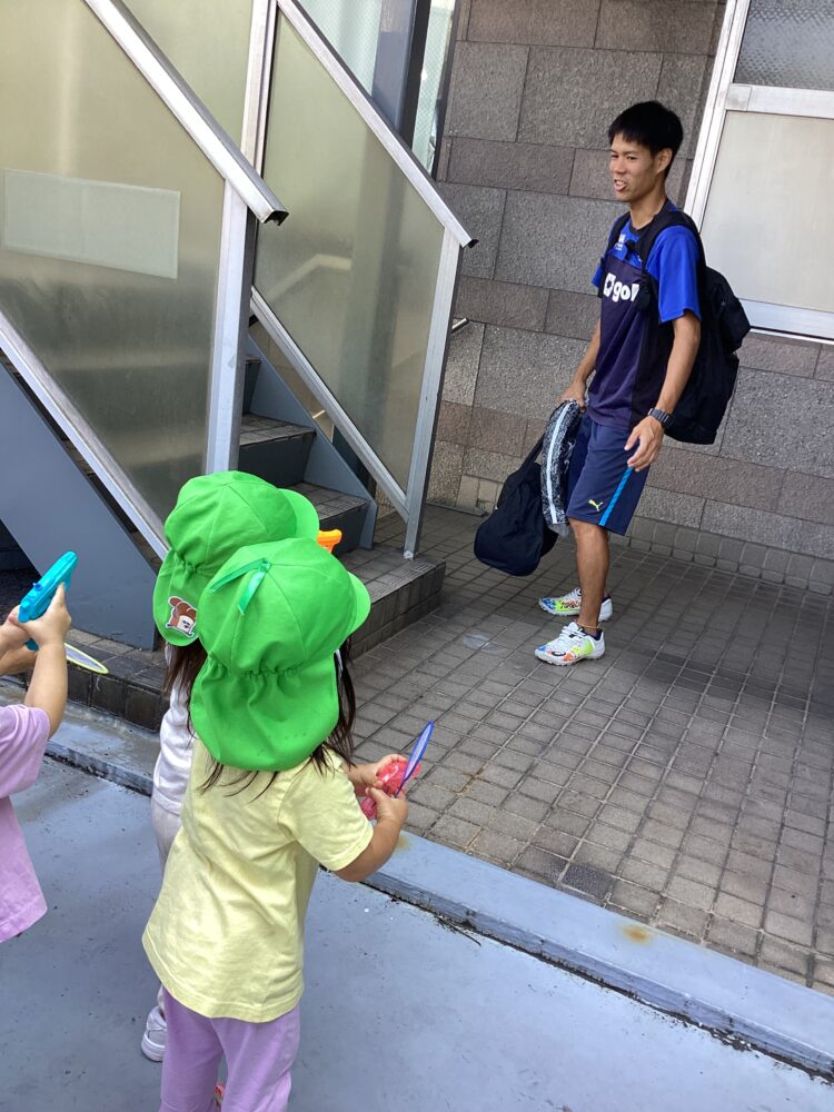 楽しかった体操教室が終わって、先生が階段を降りる時に、水鉄砲で遊んでいた子どもたち!「あ、先生だ~」と言いながら「ぴゅ~」と水をかけようと狙っていて最後まで体操教室の先生と楽しい時間を過ごしていました🎵