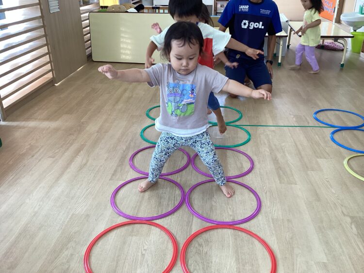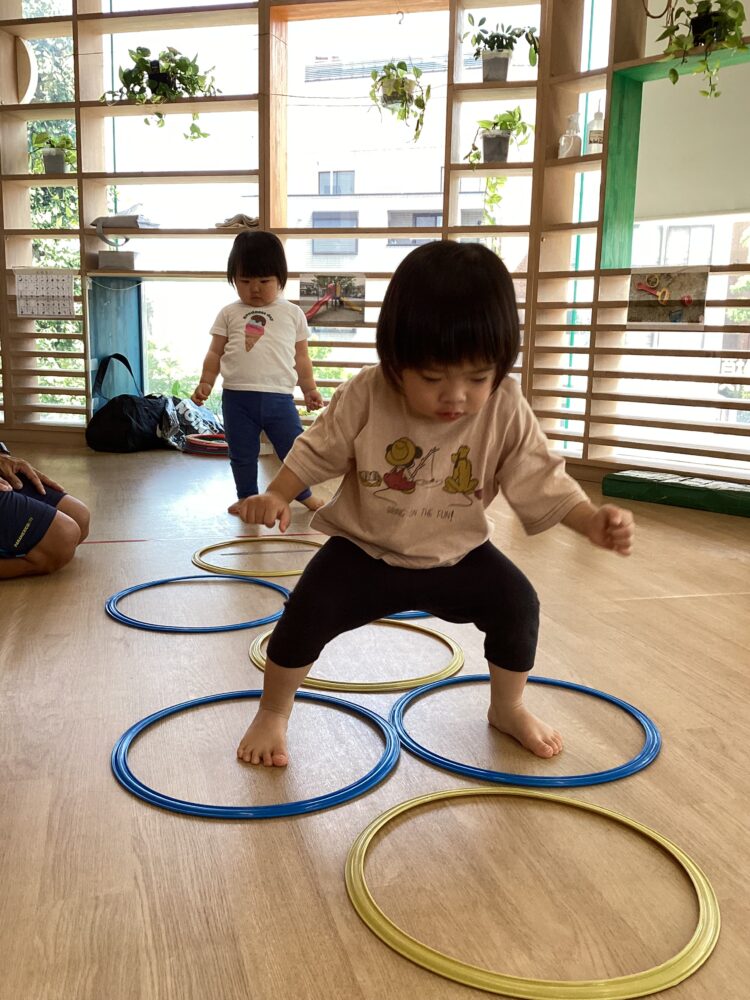 今回はフラフープであそびました!横に並んだフラフープの中にそれっとジャンプ💨