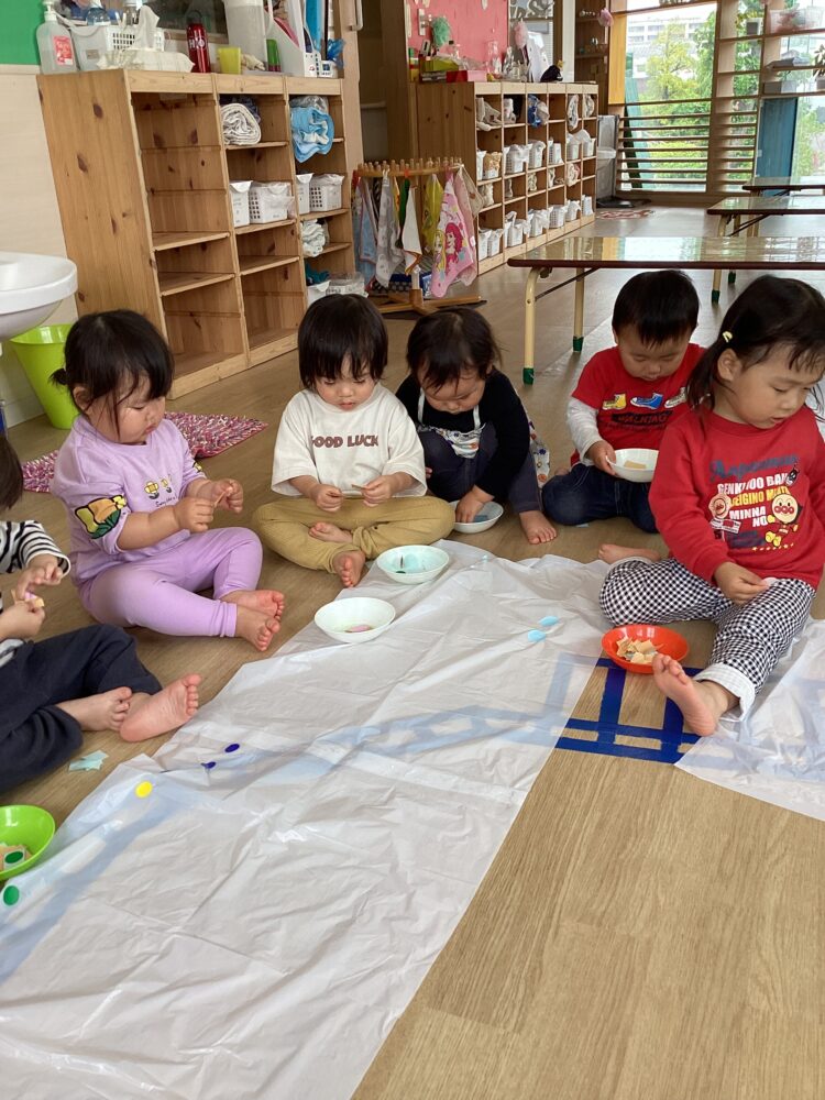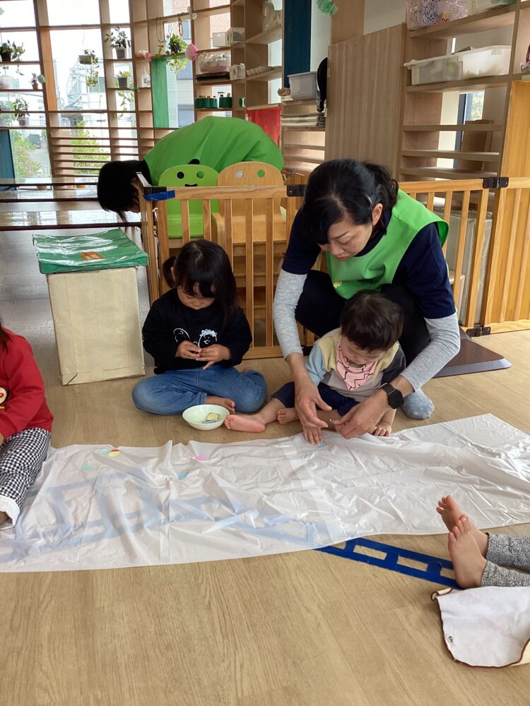と保育者や友だちと話しながらたくさんの模様を作ってあげました😄