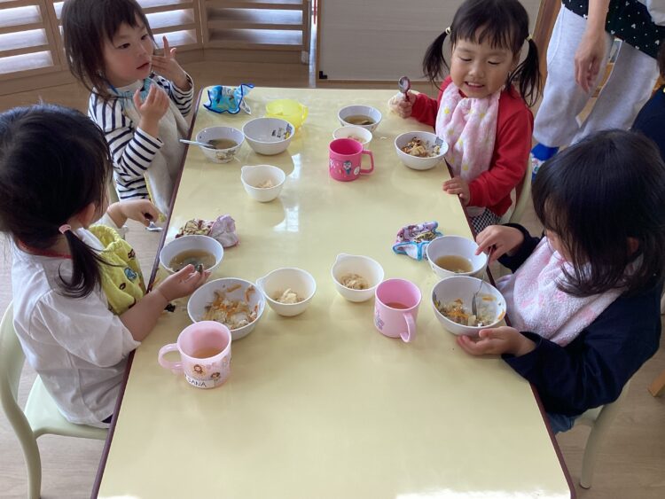 「お豆さんいるね🫛」「美味しいね」「これは〇〇だね」と会話も弾みながら楽しく給食を食べました😄