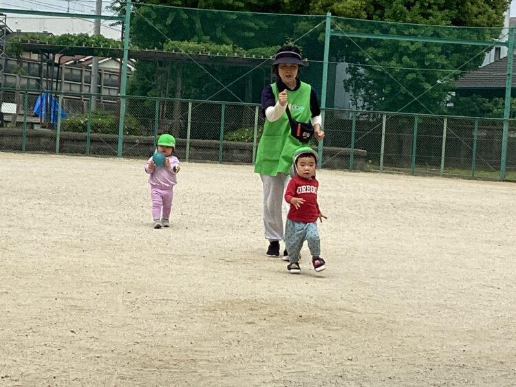 保育者と追いかけっこをしたり砂遊びをしたりして楽しみました🎵