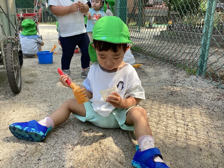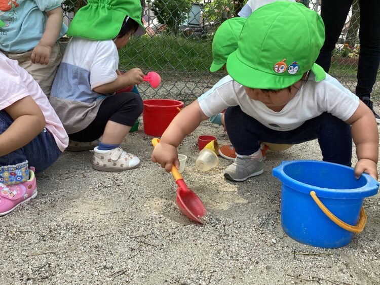 砂遊びでは、スコップを上手に使って砂をすくい、バケツにじゃー!
