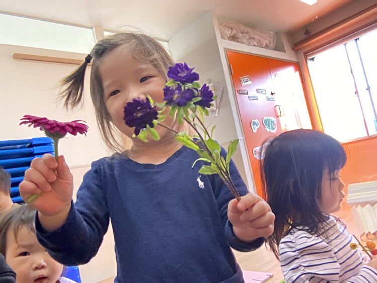 「これがいい」「(茎を)短く切ってー」とおしゃべりを楽しみながらそれぞれ素敵な作品が完成しました♫