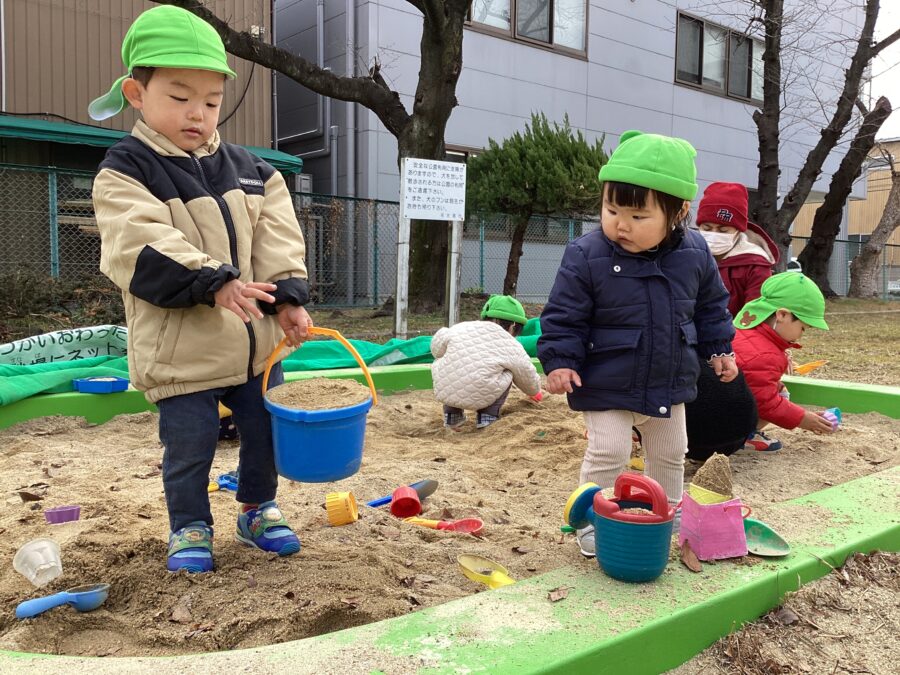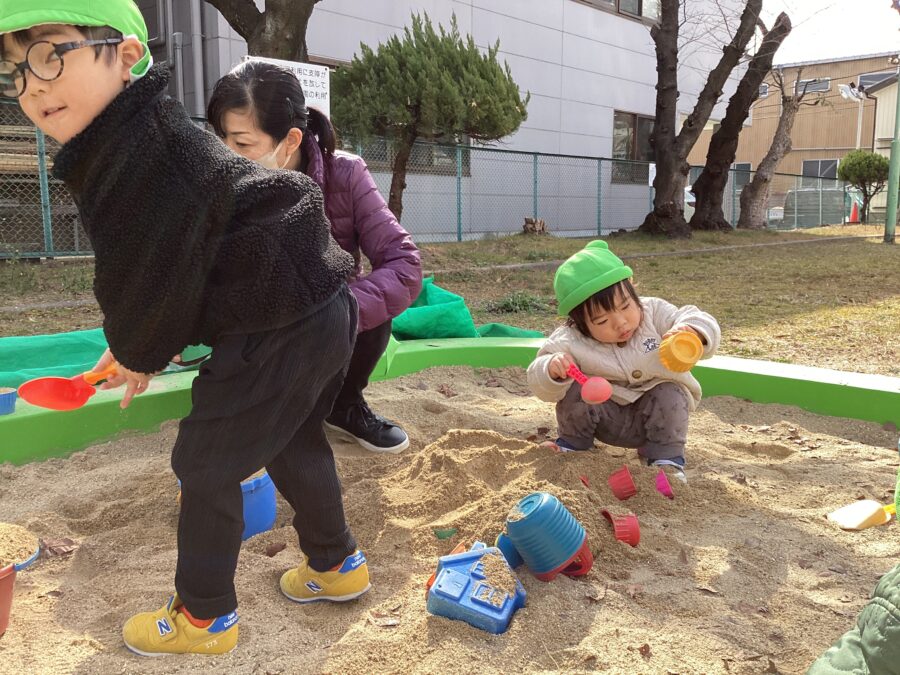 砂場では自分でスコップを使って、カップに入れたり、出したりの繰り返しを楽しむお友だち😊