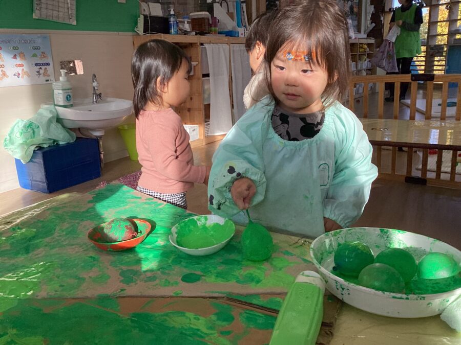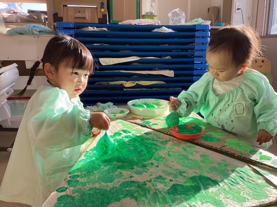 絵の具を使ってクリスマスツリーの制作あそびの続きが始まりました!