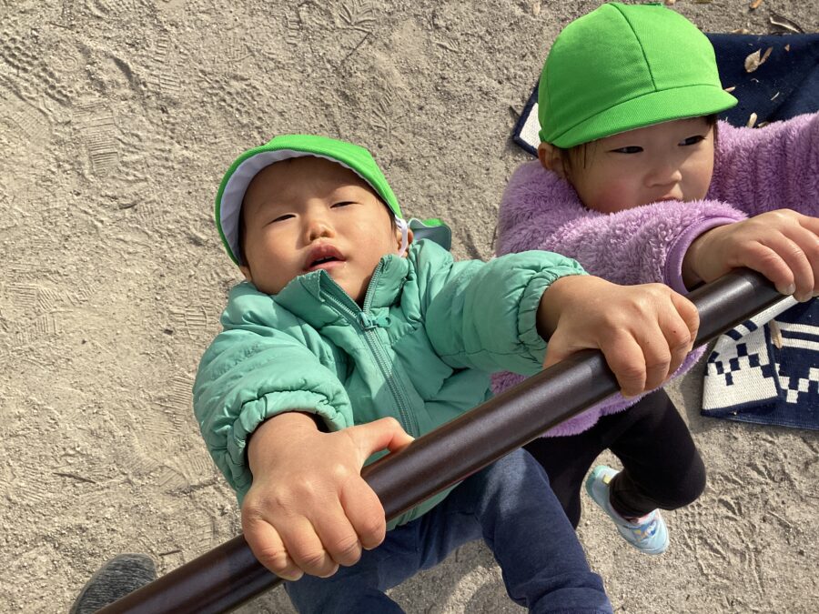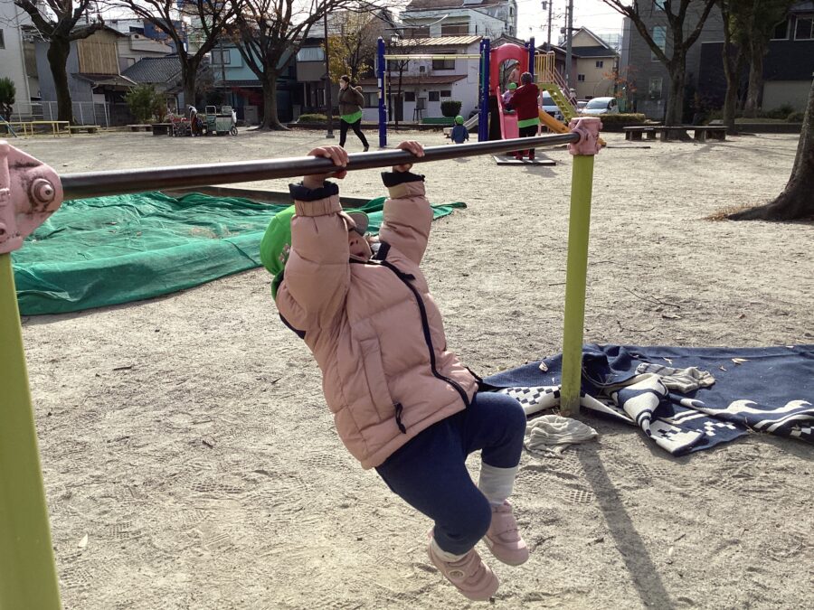 鉄棒を見つけたお友だちはぶらーんとぶら下がり、先日の体操教室を思い出す保育者でした💕