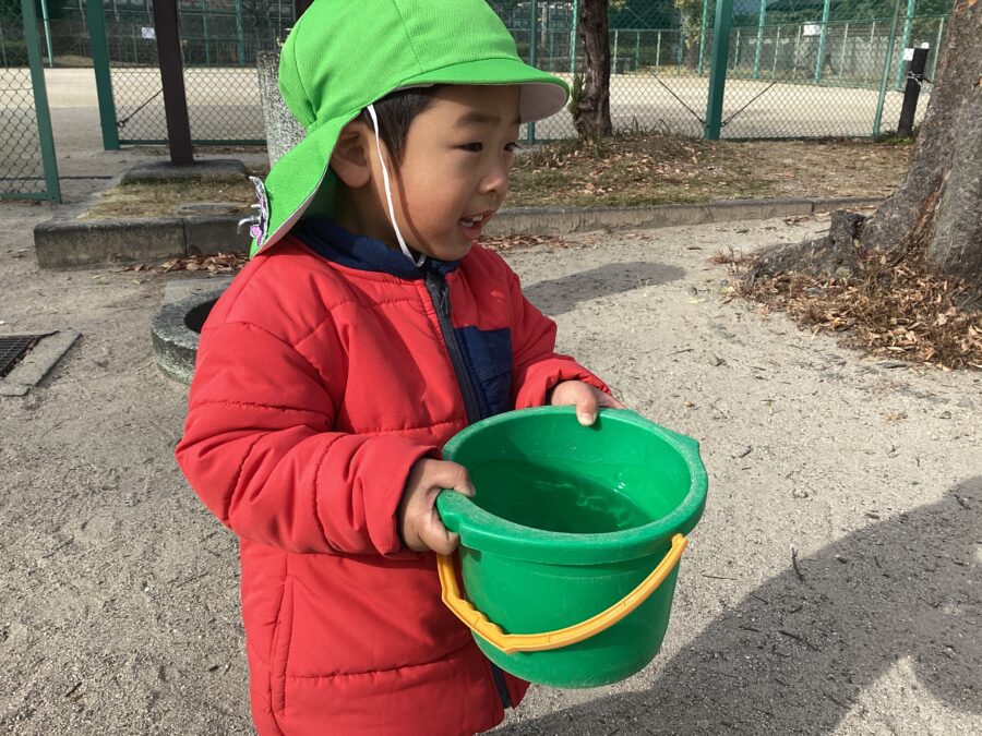 水を入れたバケツをこぼれないように慎重に運び、、、