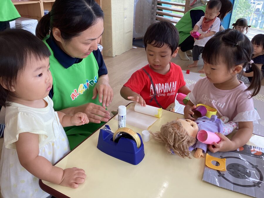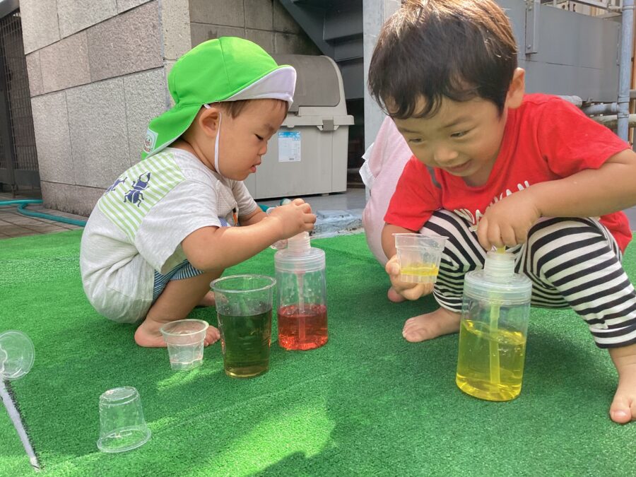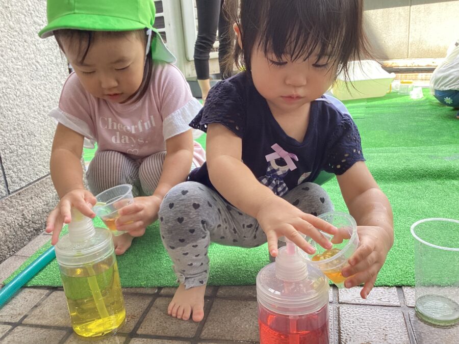 透明カップに色水を入れて、「むらさきになった!」「緑になった!」と色の変化を楽しんでいました。