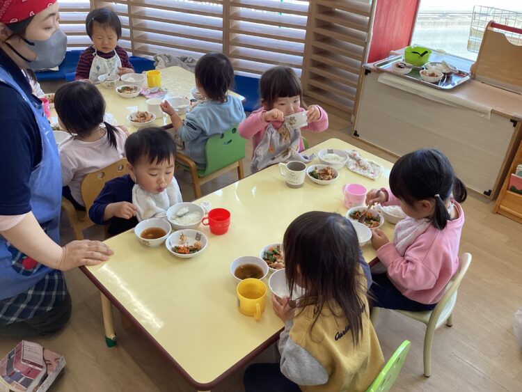 大きな唐揚げを頬張り、みんなで美味しくたべました😋