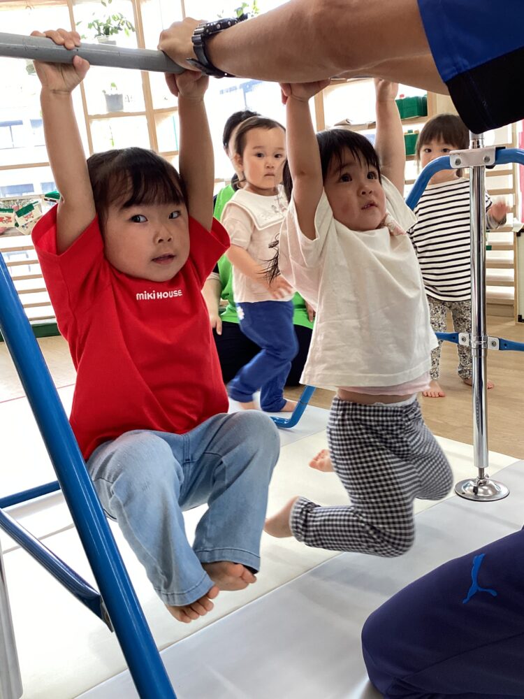 ちゅうりっぷ組さんは先生に支えてもらってぶら下がったり豚の丸焼きという技にチャレンジしたりしました!